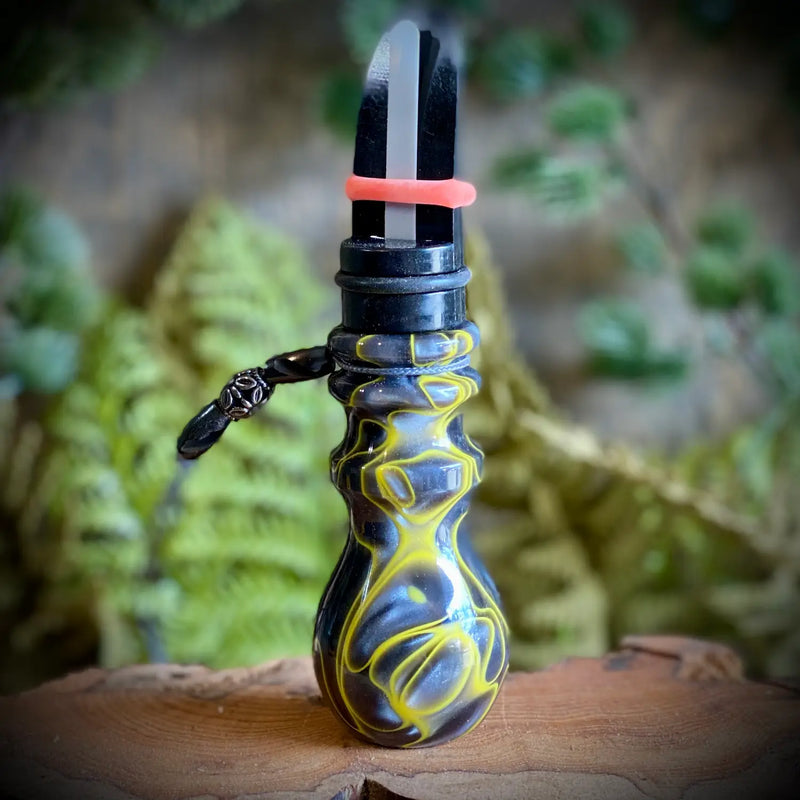 Hand turned and polished acrylic cow elk call. Excellent sound versatility from excited estrous sounds to more social mews. Colors swirl in dewy yellow and black with light blue and gray highlights.